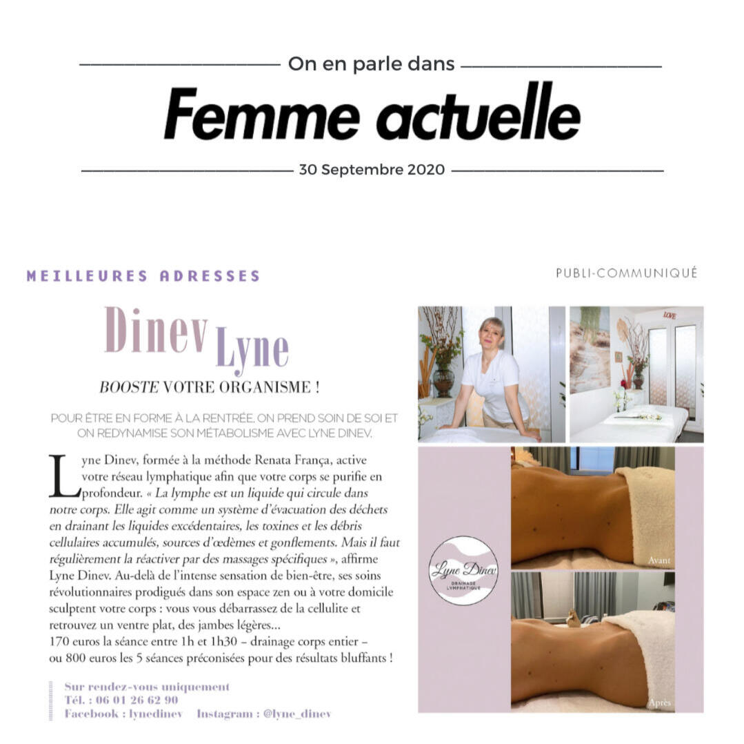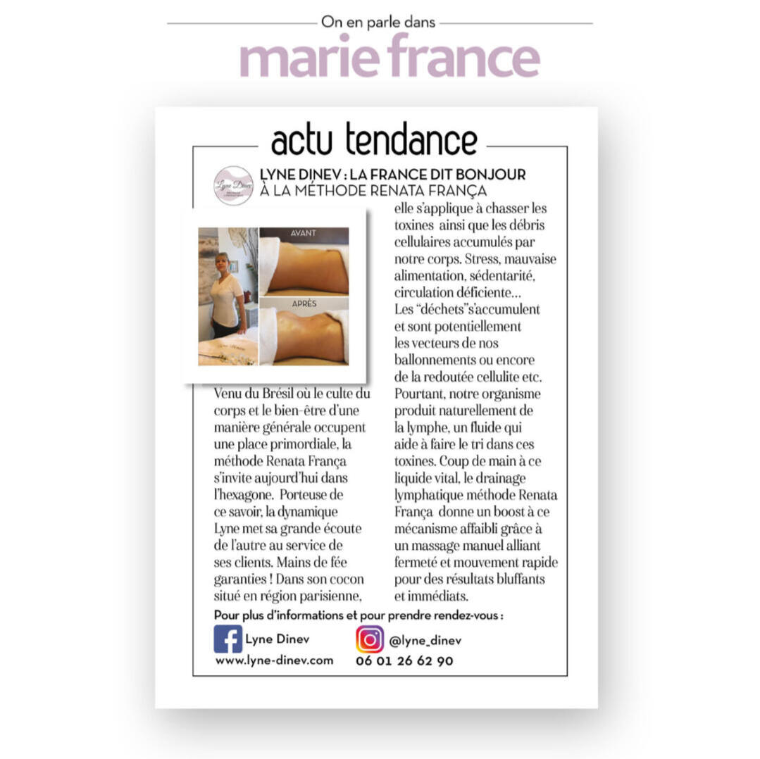 Le système lymphatique, est composé de vaisseaux, de ganglions et d'organes reliés à toutes les parties du corps porteurs de lymphe. La principale fonction de ce système est la circulation des cellules immunitaires dans tout le corps et l'activation de la réponse immunitaire lors d'une infection. Il contribue également à la circulation des hormones et des nutriments et permet le drainage des excès de liquide au niveau des tissus.**Le principe : ** La méthode Renata França consiste en une pression ferme et un rythme accéléré, en plus de pompages et des manœuvres exclusives qui permettent des résultats immédiats.Bénéfices : Le drainage lymphatique manuel aide à éliminer les excès d'eau, les déchets cellulaires et les toxines. Diminue les sensations de jambes lourdes. Réduit la cellulite. Combat la rétention d’eau. Facilite le sommeil. Résultats visibles dès la 1ère séance.Fréquence : Cure de 5 séances pour un résultat optimal, ensuite une séance chaque mois en entretien.Contre-indications : Tout type de maladie infectieuse, Tuberculose, Cancer, Inflammation aiguë, Naevus, Thrombose, Phlébite,Oedème cardiaque, Hyperthyroïdie, Asthme, Hypotension artérielle.
